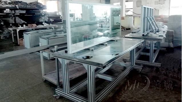 鋁板鏡面工作臺 由鋁型材及鋁型角碼組裝而成,臺面可配防靜電臺面或鋁合金臺面。外形美觀,整體拆裝簡易,結(jié)構(gòu)堅固被廣泛用于車間生產(chǎn)組裝,檢驗、測試等。其常用鋁型材規(guī)格有40*40、40*60、50*50等,也可根據(jù)不同需求選配不同材料制作。